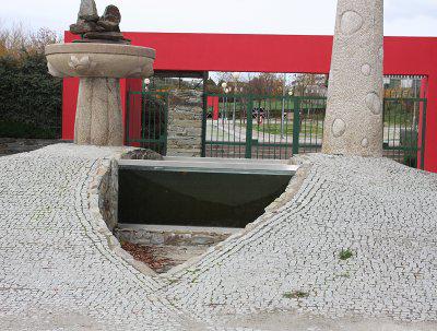 Monumento em granito com um tanque de água em vidro no meio.
